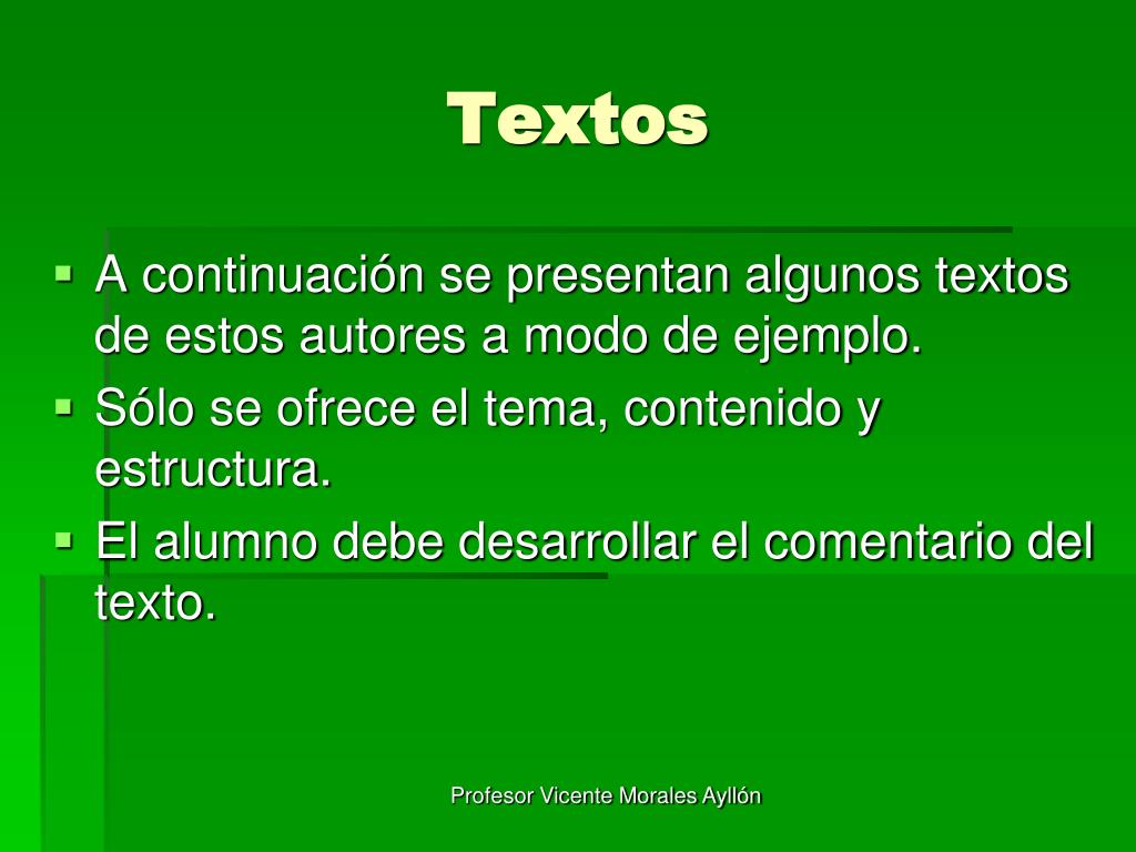 Textos • A continuación se presentan algunos textos de estos autores a modo de ejemplo. • Sólo se ofrece el tema, contenido y estructura. • El alumno debe desarrollar el comentario del texto. Profesor Vicente Morales Ayllón