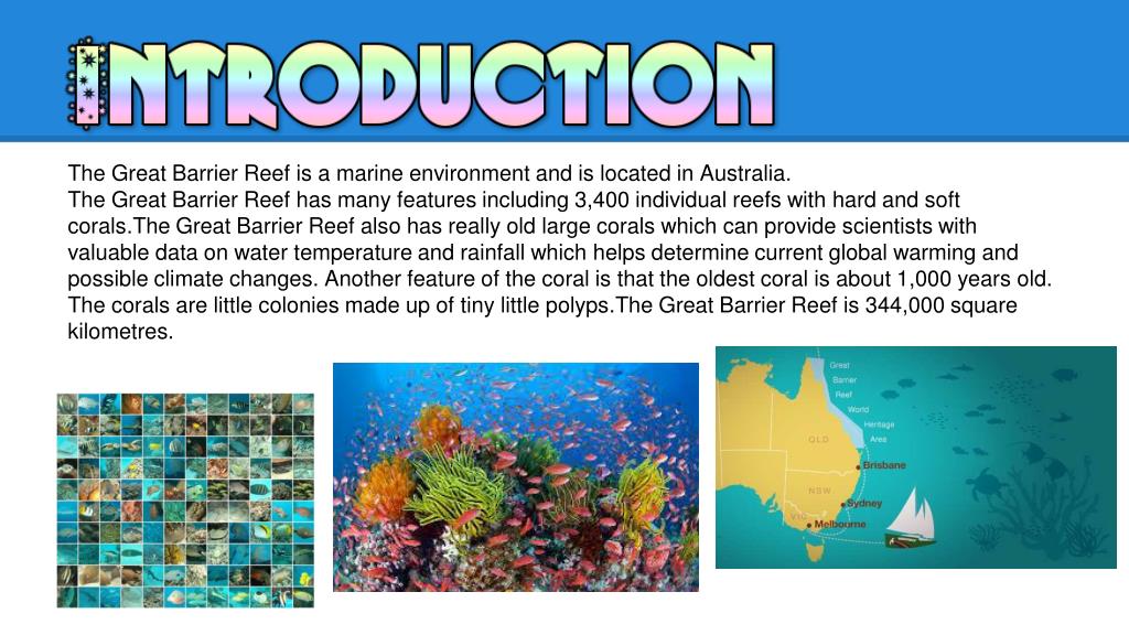 The Great Barrier Reef is a marine environment and is located in Australia. The Great Barrier Reef has many features including 3,400 individual reefs with hard and soft corals.The Great Barrier Reef also has really old large corals which can provide scientists with valuable data on water temperature and rainfall which helps determine current global warming and possible climate changes. Another feature of the coral is that the oldest coral is about 1,000 years old. The corals are little colonies made up of tiny little polyps.The Great Barrier Reef is 344,000 square kilometres.