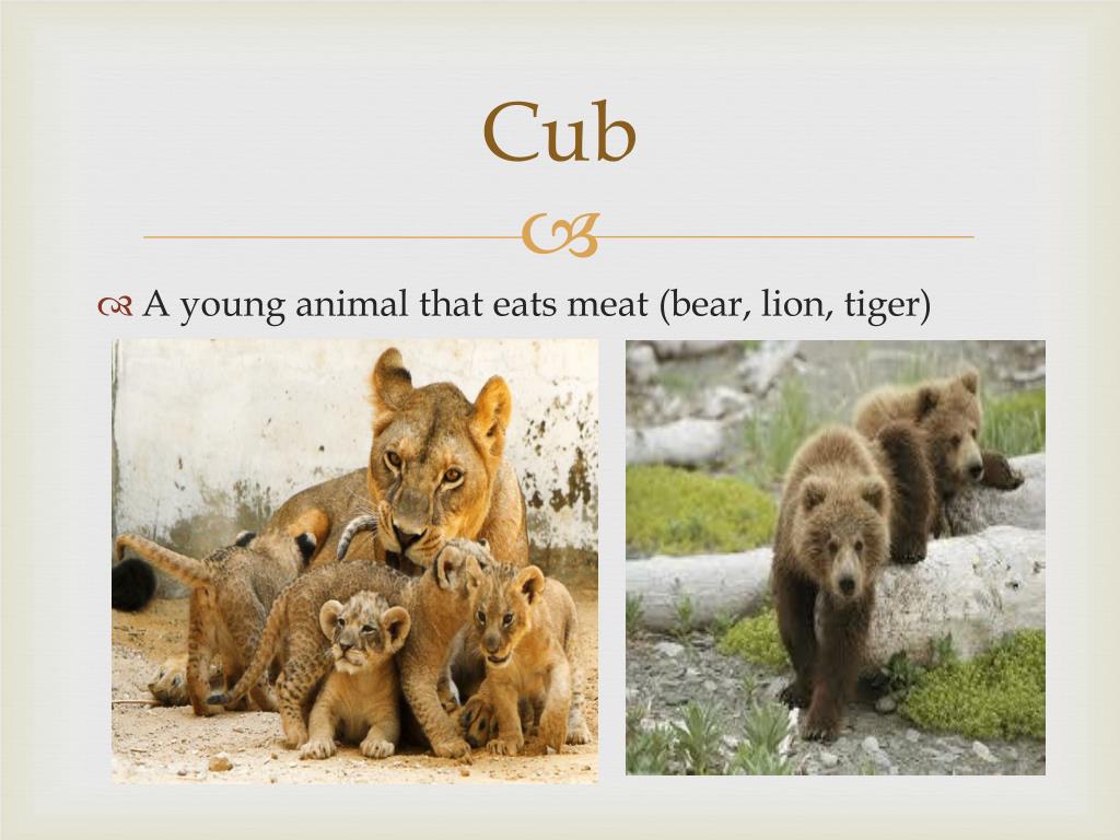 Cub • A young animal that eats meat (bear, lion, tiger)