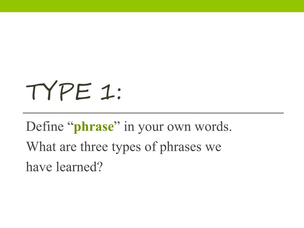 Type 1: Define “phrase” in your own words. What are three types of phrases we have learned?