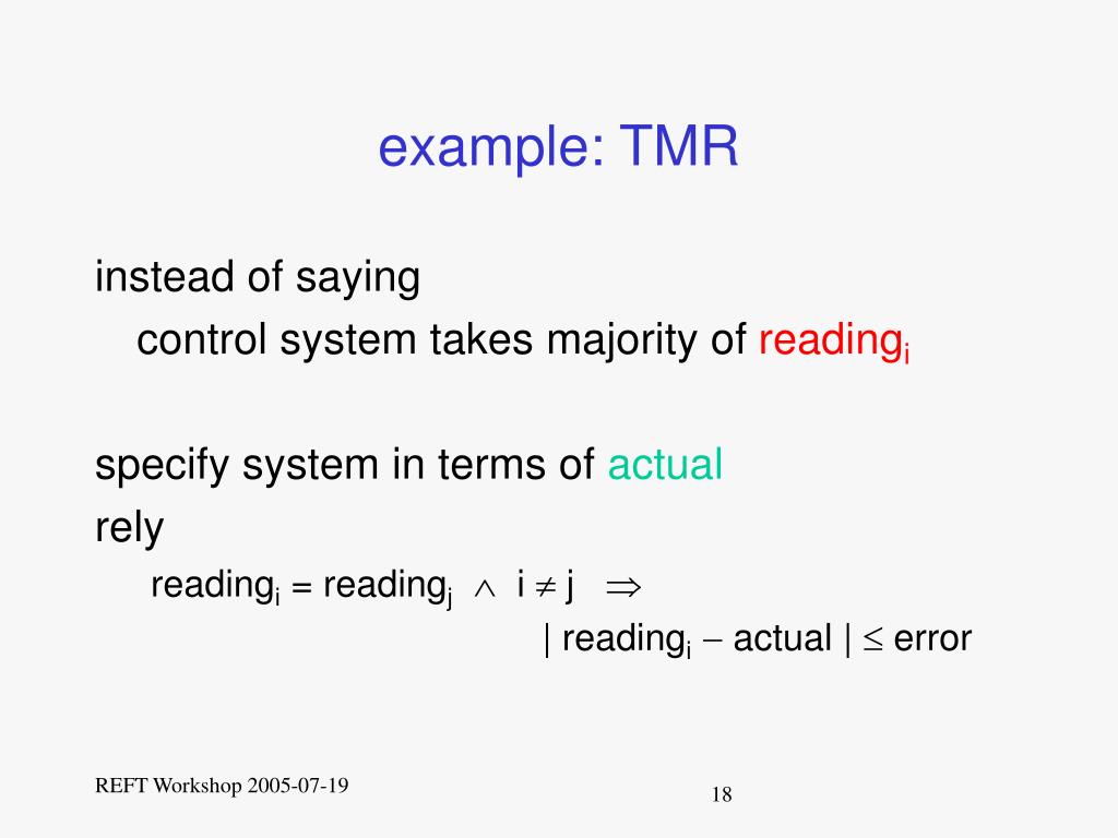 example: TMR instead of saying control system takes majority of readingi specify system in terms of actual rely readingi = readingjÙ i ¹ j Þ | readingi- actual | £ error