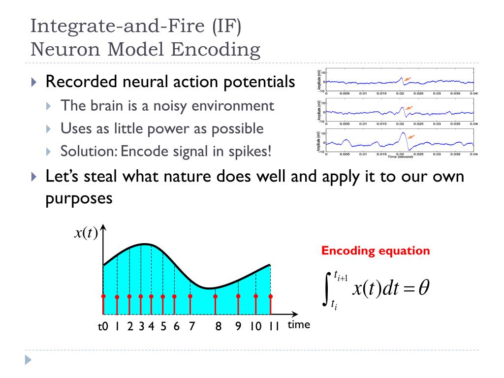 Encoding equation 6 t0 1 2 3 4 5 7 8 9 10 11 Integrate-and-Fire (IF)Neuron Model Encoding • Recorded neural action potentials • The brain is a noisy environment • Uses as little power as possible • Solution: Encode signal in spikes! • Let’s steal what nature does well and apply it to our own purposes time