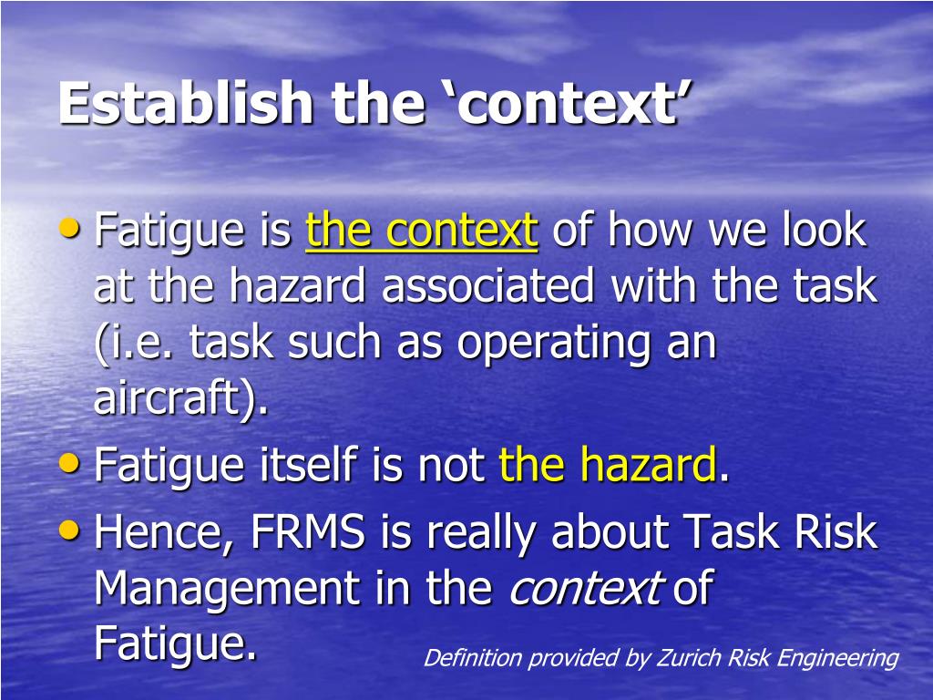 Establish the ‘context’ • Fatigue is the context of how we look at the hazard associated with the task (i.e. task such as operating an aircraft). • Fatigue itself is not the hazard. • Hence, FRMS is really about Task Risk Management in the context of Fatigue. Definition provided by Zurich Risk Engineering