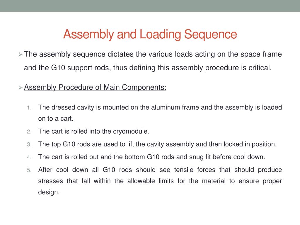Assembly and Loading Sequence • The assembly sequence dictates the various loads acting on the space frame and the G10 support rods, thus defining this assembly procedure is critical. • Assembly Procedure of Main Components: • The dressed cavity is mounted on the aluminum frame and the assembly is loaded on to a cart. • The cart is rolled into the cryomodule. • The top G10 rods are used to lift the cavity assembly and then locked in position. • The cart is rolled out and the bottom G10 rods and snug fit before cool down. • After cool down all G10 rods should see tensile forces that should produce stresses that fall within the allowable limits for the material to ensure proper design.