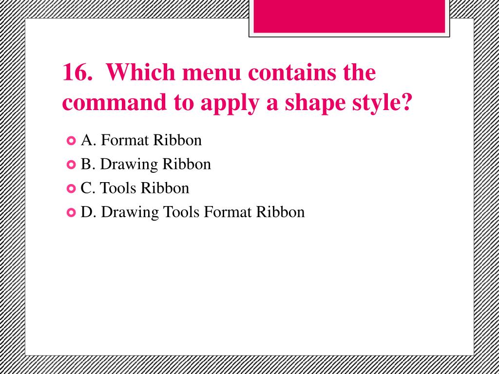 16. Which menu contains the command to apply a shape style? • A. Format Ribbon • B. Drawing Ribbon • C. Tools Ribbon • D. Drawing Tools Format Ribbon