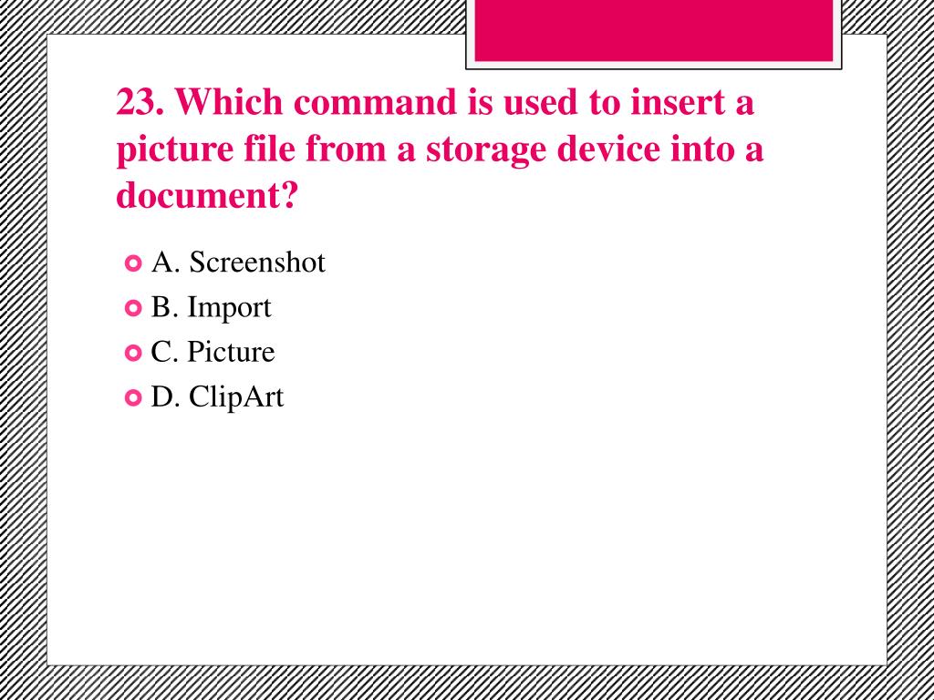23. Which command is used to insert a picture file from a storage device into a document? • A. Screenshot • B. Import • C. Picture • D. ClipArt