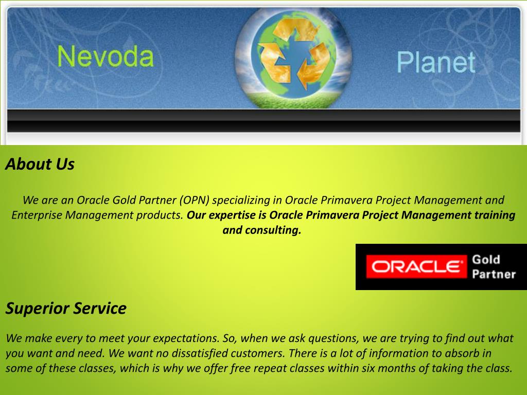 About Us We are an Oracle Gold Partner (OPN) specializing in Oracle Primavera Project Management and Enterprise Management products. Our expertise is Oracle Primavera Project Management training and consulting. Superior Service We make every to meet your expectations. So, when we ask questions, we are trying to find out what you want and need. We want no dissatisfied customers. There is a lot of information to absorb in some of these classes, which is why we offer free repeat classes within six months of taking the class.