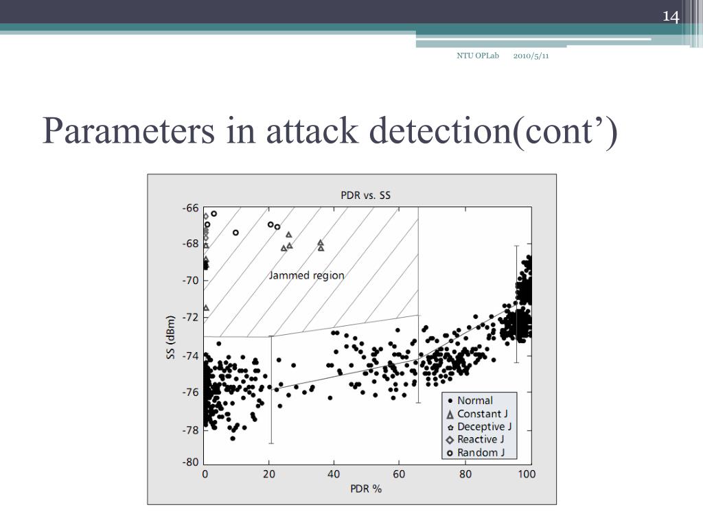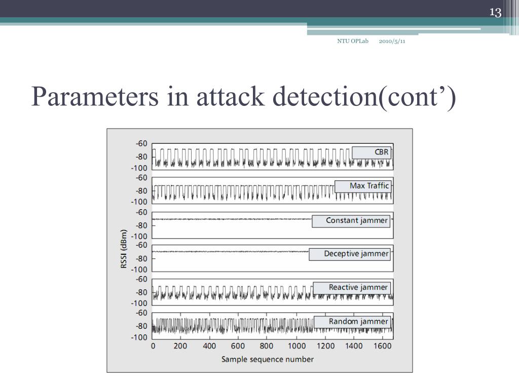 NTU OPLab Steps of tackling jamming attacks • Attack detection: • The Physical-layer. • The MAC-layer • Attack mitigation: • Overcome the effects of the attack. • Attack prevention(seldom included): • Prevent the occurrence of an attack on the network.