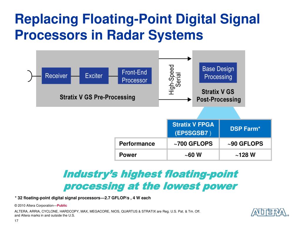 Replacing Floating-Point Digital Signal Processors in Radar Systems Industry’s highest floating-point processing at the lowest power * 32 floating-point digital signal processors—2.7 GFLOP/s , 4 W each 17