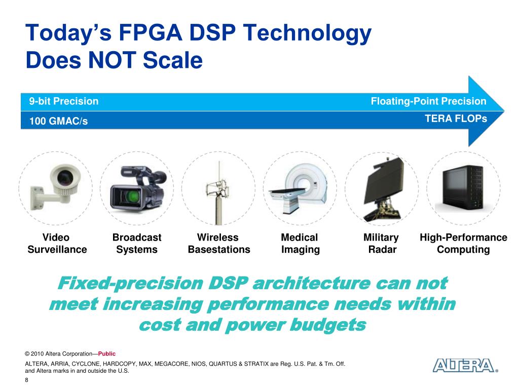 Today’s FPGA DSP Technology Does NOT Scale 9-bit Precision Floating-Point Precision TERA FLOPs 100 GMAC/s Video Surveillance Broadcast Systems Wireless Basestations Medical Imaging Military Radar High-Performance Computing Fixed-precision DSP architecture can not meet increasing performance needs within cost and power budgets