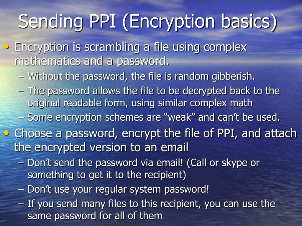 Sending PPI (Encryption basics) • Encryption is scrambling a file using complex mathematics and a password. • Without the password, the file is random gibberish. • The password allows the file to be decrypted back to the original readable form, using similar complex math • Some encryption schemes are “weak” and can’t be used. • Choose a password, encrypt the file of PPI, and attach the encrypted version to an email • Don’t send the password via email! (Call or skype or something to get it to the recipient) • Don’t use your regular system password! • If you send many files to this recipient, you can use the same password for all of them