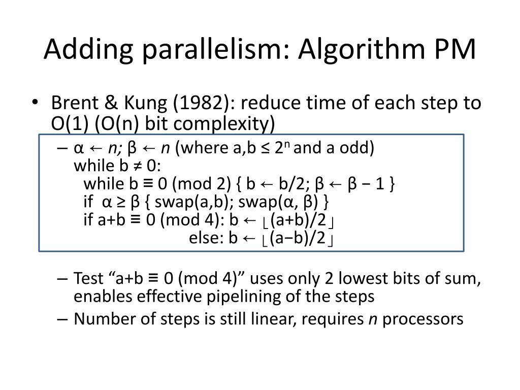 Adding parallelism: Algorithm PM • Brent & Kung (1982): reduce time of each step to O(1) (O(n) bit complexity) • α← n; β ← n (where a,b ≤ 2n and a odd)while b ≠ 0: while b ≡0 (mod 2) { b ← b/2; β← β− 1 } if α ≥β { swap(a,b); swap(α, β) } if a+b≡ 0 (mod 4): b ← ⌊(a+b)/2⌋else: b ← ⌊(a−b)/2⌋ • Test “a+b≡ 0 (mod 4)” uses only 2 lowest bits of sum, enables effective pipelining of the steps • Number of steps is still linear, requires n processors