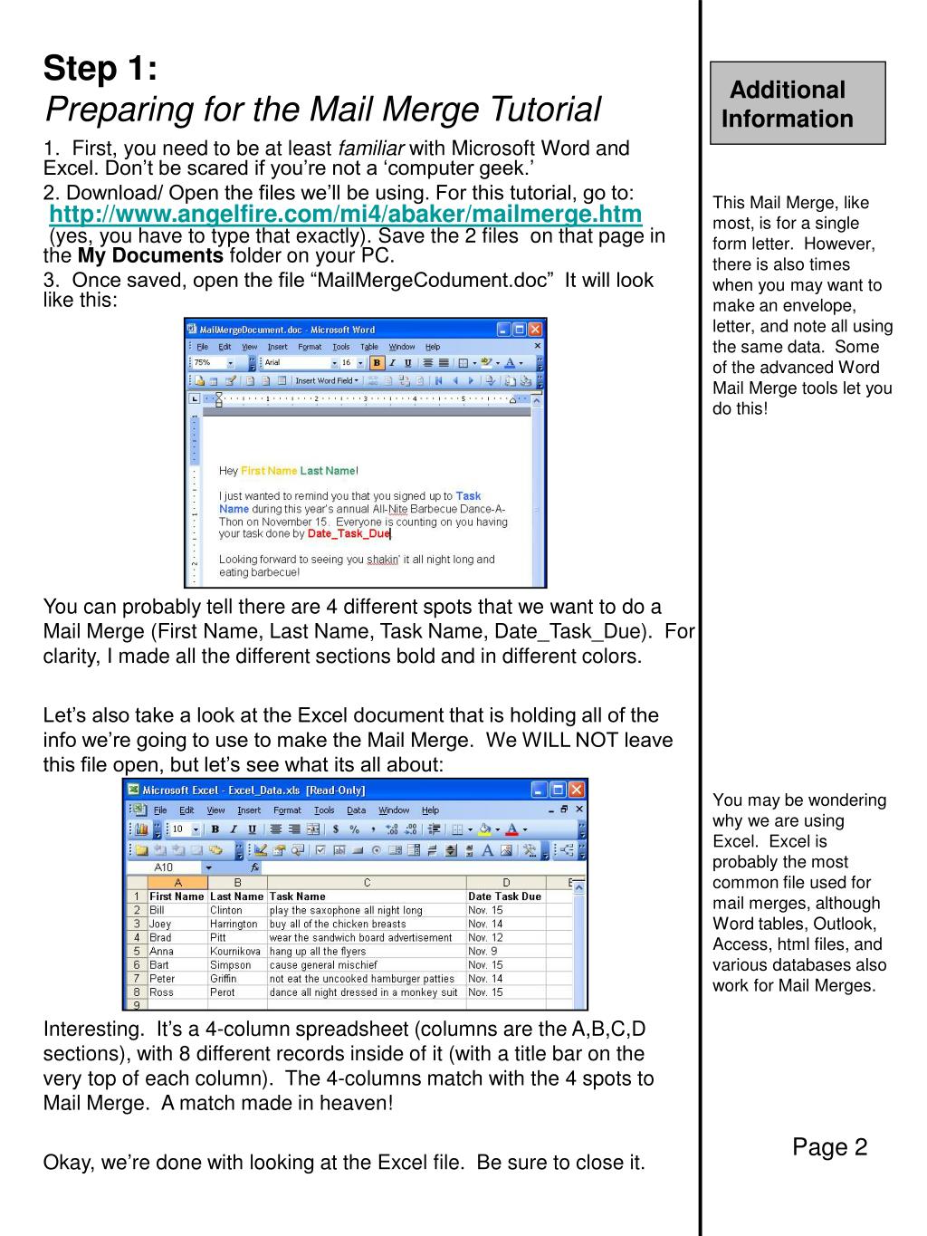 Additional Information. Step 0: What in the world is a Mail Merge?. This side panel of the instructional is strictly additional info. You DO NOT need to read this section to follow this tutorial.
