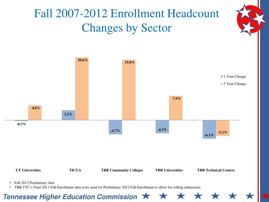 Tennessee Higher Education Commission Fall 2007-2012 Enrollment Headcount Changes by Sector • Fall 2012 Preliminary data • TBR TTC’s Final 2011 Fall Enrollment data were used for Preliminary 2012 Fall Enrollment to allow for rolling admissions
