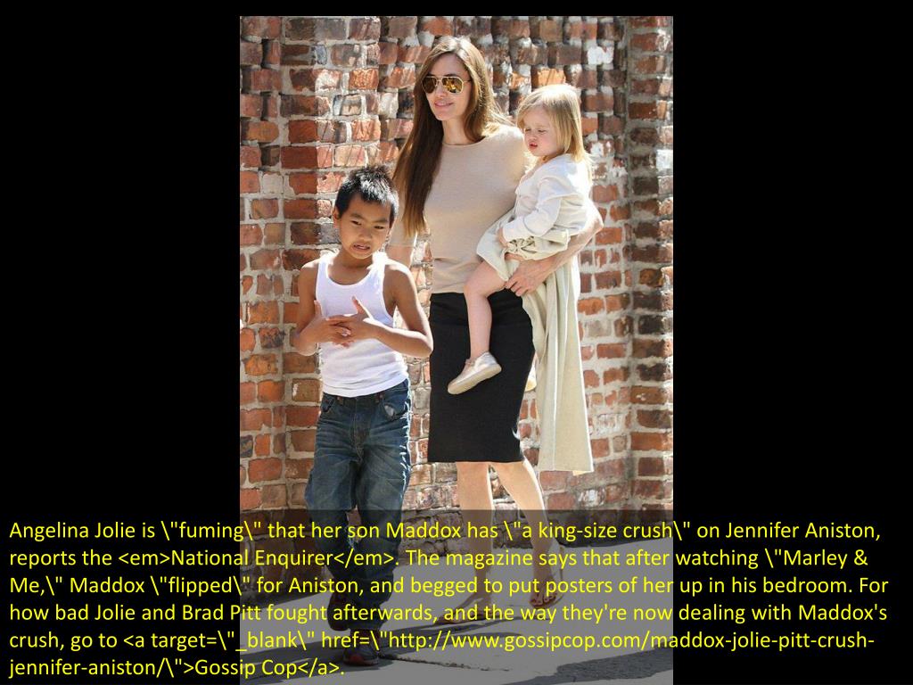 Angelina Jolie is \"fuming\" that her son Maddox has \"a king-size crush\" on Jennifer Aniston, reports the <em>National Enquirer</em>. The magazine says that after watching \"Marley & Me,\" Maddox \"flipped\" for Aniston, and begged to put posters of her up in his bedroom. For how bad Jolie and Brad Pitt fought afterwards, and the way they're now dealing with Maddox's crush, go to <a target=\"_blank\" href=\"http://www.gossipcop.com/maddox-jolie-pitt-crush-jennifer-aniston/\">Gossip Cop</a>.