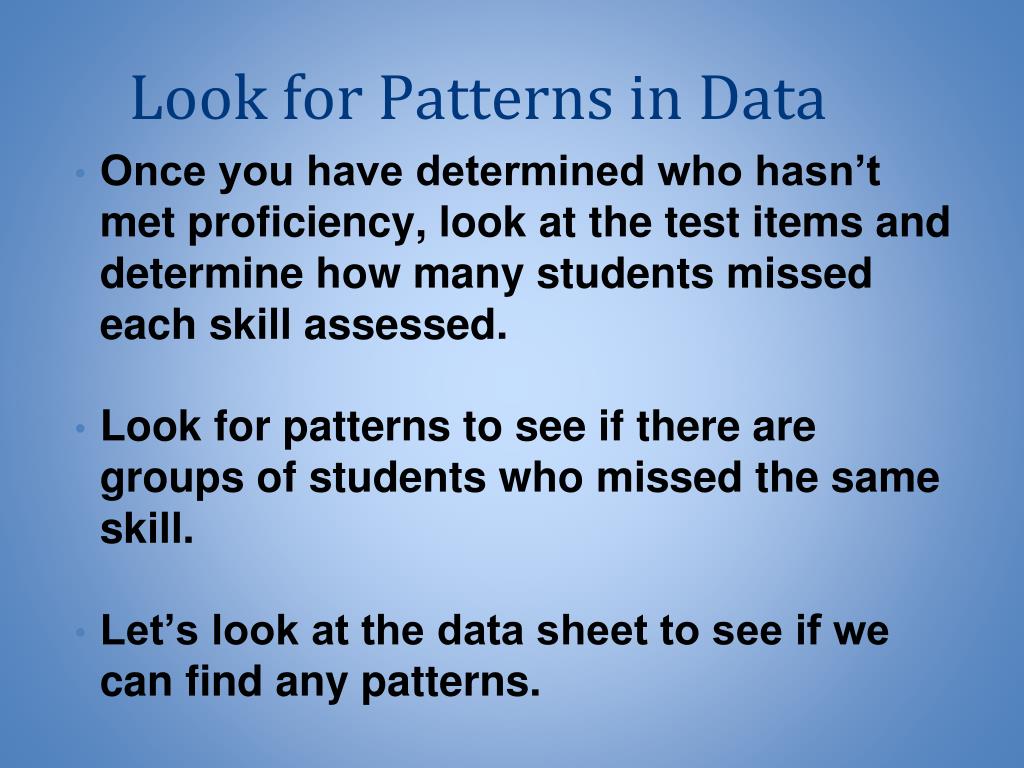 Look for Patterns in Data • Once you have determined who hasn’t met proficiency, look at the test items and determine how many students missed each skill assessed. • Look for patterns to see if there are groups of students who missed the same skill. • Let’s look at the data sheet to see if we can find any patterns.