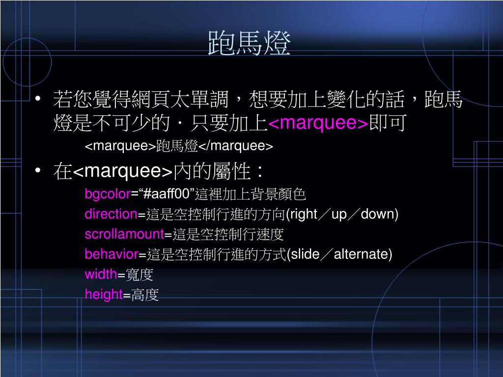 跑馬燈 • 若您覺得網頁太單調,想要加上變化的話,跑馬燈是不可少的.只要加上<marquee>即可 <marquee>跑馬燈</marquee> • 在<marquee>內的屬性 : bgcolor=“#aaff00”這裡加上背景顏色 direction=這是空控制行進的方向(right/up/down) scrollamount=這是空控制行速度 behavior=這是空控制行進的方式(slide/alternate) width=寬度 height=高度