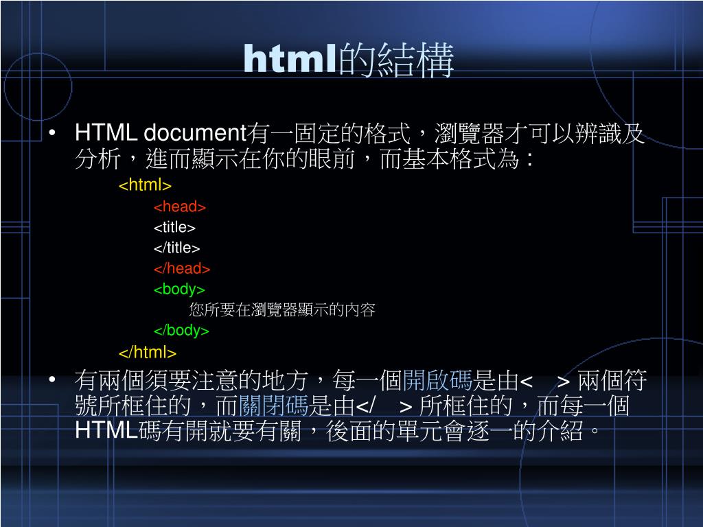 html的結構 • HTML document有一固定的格式,瀏覽器才可以辨識及分析,進而顯示在你的眼前,而基本格式為 : <html> <head> <title> </title> </head> <body> 您所要在瀏覽器顯示的內容 </body> </html> • 有兩個須要注意的地方,每一個開啟碼是由<> 兩個符號所框住的,而關閉碼是由</> 所框住的,而每一個HTML碼有開就要有關,後面的單元會逐一的介紹。
