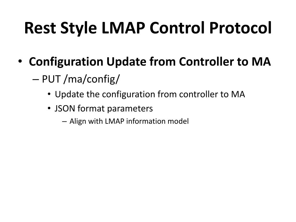 Rest Style LMAP Control Protocol • Configuration Update from Controller to MA • PUT /ma/config/ • Update the configuration from controller to MA • JSON format parameters • Align with LMAP information model