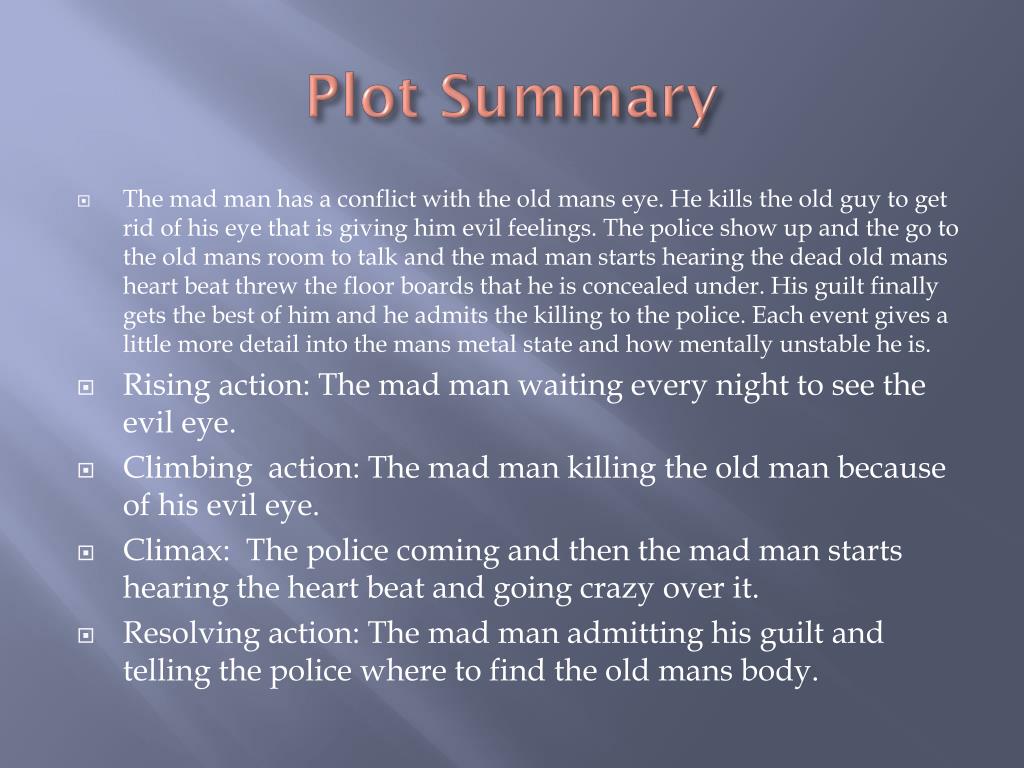 Plot Summary • The mad man has a conflict with the old mans eye. He kills the old guy to get rid of his eye that is giving him evil feelings. The police show up and the go to the old mans room to talk and the mad man starts hearing the dead old mans heart beat threw the floor boards that he is concealed under. His guilt finally gets the best of him and he admits the killing to the police. Each event gives a little more detail into the mans metal state and how mentally unstable he is. • Rising action: The mad man waiting every night to see the evil eye. • Climbing action: The mad man killing the old man because of his evil eye. • Climax: The police coming and then the mad man starts hearing the heart beat and going crazy over it. • Resolving action: The mad man admitting his guilt and telling the police where to find the old mans body.
