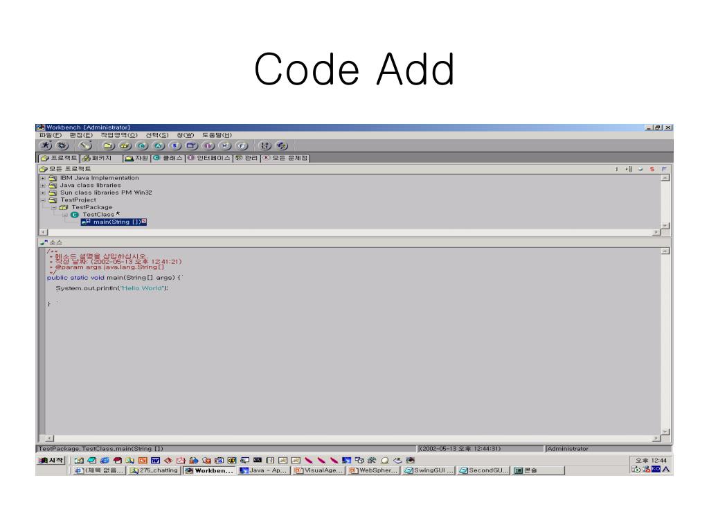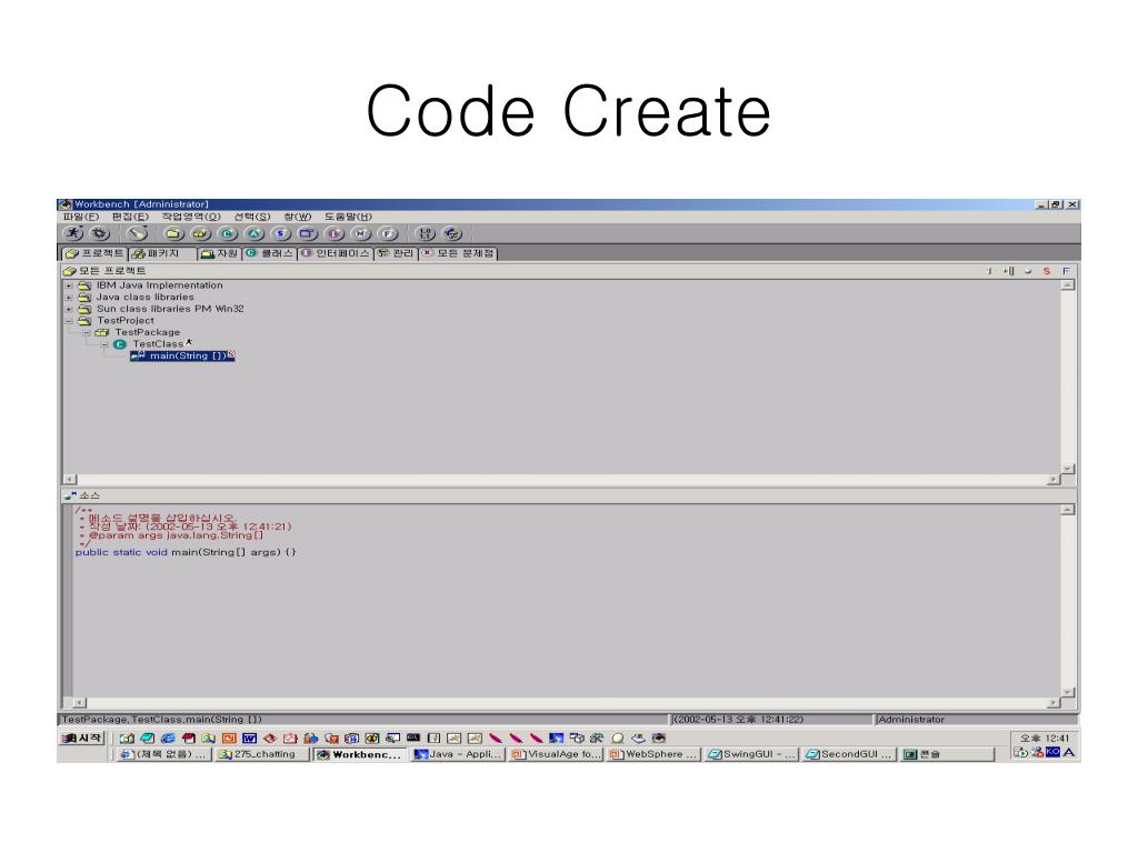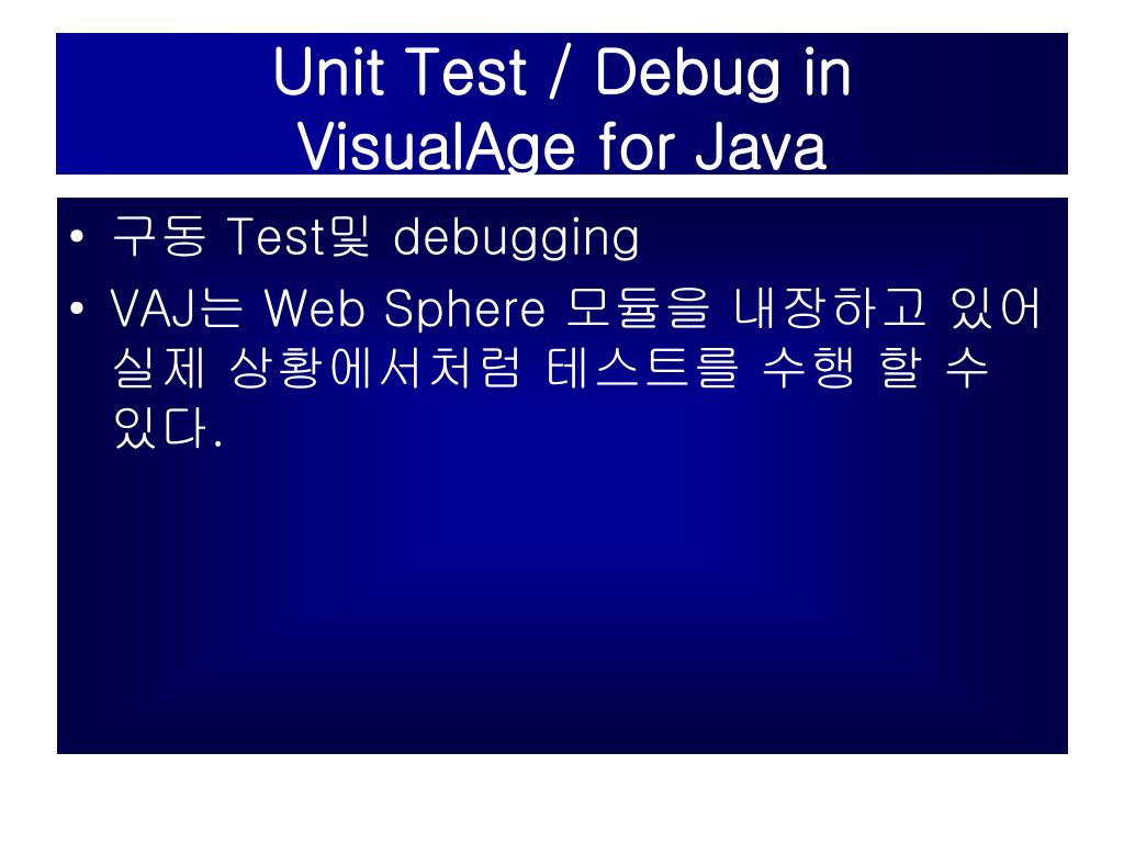 Unit Test / Debug inVisualAge for Java • 구동 Test및 debugging • VAJ는 Web Sphere 모듈을 내장하고 있어 실제 상황에서처럼 테스트를 수행 할 수 있다.