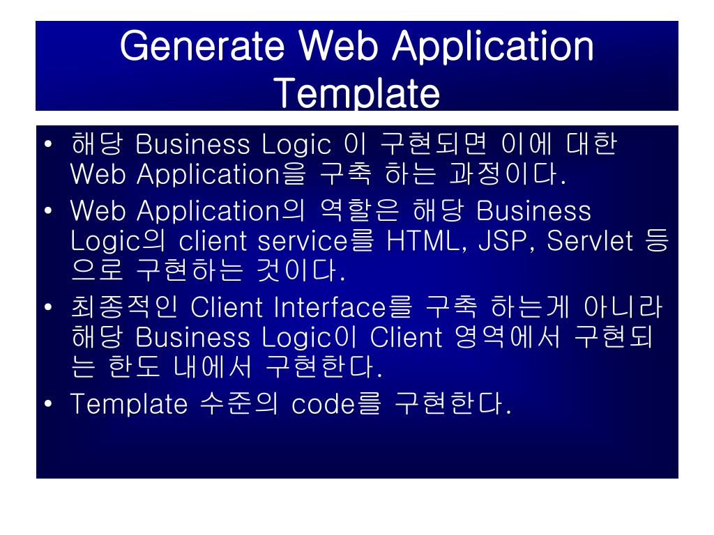 Generate Web Application Template • 해당 Business Logic 이 구현되면 이에 대한 Web Application을 구축 하는 과정이다. • Web Application의 역할은 해당 Business Logic의 client service를 HTML, JSP, Servlet 등으로 구현하는 것이다. • 최종적인 Client Interface를 구축 하는게 아니라 해당 Business Logic이 Client 영역에서 구현되는 한도 내에서 구현한다. • Template 수준의 code를 구현한다.