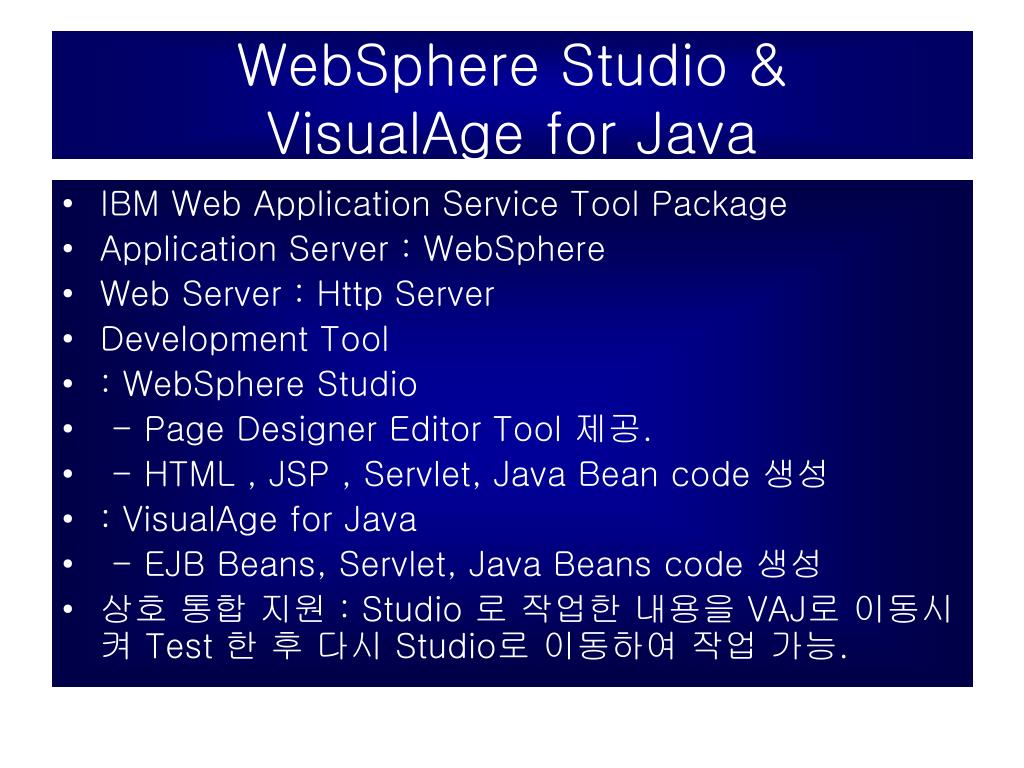 WebSphere Studio & VisualAge for Java • IBM Web Application Service Tool Package • Application Server : WebSphere • Web Server : Http Server • Development Tool • : WebSphere Studio • - Page Designer Editor Tool 제공. • - HTML , JSP , Servlet, Java Bean code 생성 • : VisualAge for Java • - EJB Beans, Servlet, Java Beans code 생성 • 상호 통합 지원 : Studio 로 작업한 내용을 VAJ로 이동시켜 Test 한 후 다시 Studio로 이동하여 작업 가능.