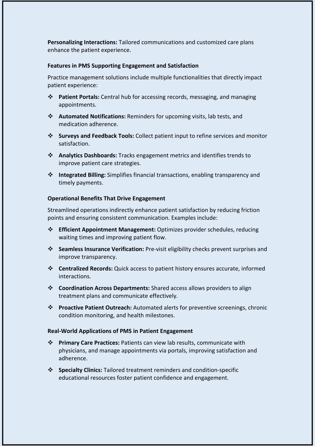Personalizing Interactions: Tailored communications and customized care plans enhance the patient experience. Features in PMS Supporting Engagement and Satisfaction Practice management solutions include multiple functionalities that directly impact patient experience: Patient Portals: Central hub for accessing records, messaging, and managing appointments. Automated Notifications: Reminders for upcoming visits, lab tests, and medication adherence. Surveys and Feedback Tools: Collect patient input to refine services and monitor satisfaction. Analytics Dashboards: Tracks engagement metrics and identifies trends to improve patient care strategies. Integrated Billing: Simplifies financial transactions, enabling transparency and timely payments. Operational Benefits That Drive Engagement Streamlined operations indirectly enhance patient satisfaction by reducing friction points and ensuring consistent communication. Examples include: Efficient Appointment Management: Optimizes provider schedules, reducing waiting times and improving patient flow. Seamless Insurance Verification: Pre-visit eligibility checks prevent surprises and improve transparency. Centralized Records: Quick access to patient history ensures accurate, informed interactions. Coordination Across Departments: Shared access allows providers to align treatment plans and communicate effectively. Proactive Patient Outreach: Automated alerts for preventive screenings, chronic condition monitoring, and health milestones. Real-World Applications of PMS in Patient Engagement Primary Care Practices: Patients can view lab results, communicate with physicians, and manage appointments via portals, improving satisfaction and adherence. Specialty Clinics: Tailored treatment reminders and condition-specific educational resources foster patient confidence and engagement.
