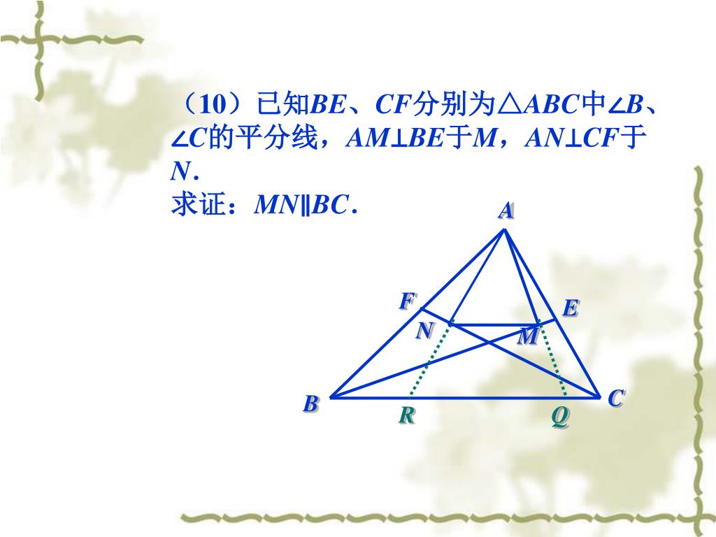 (10)已知BE、CF分别为△ABC中∠B、∠C的平分线,AM⊥BE于M,AN⊥CF于N.(10)已知BE、CF分别为△ABC中∠B、∠C的平分线,AM⊥BE于M,AN⊥CF于N. 求证:MN∥BC. A F E N M C B R Q