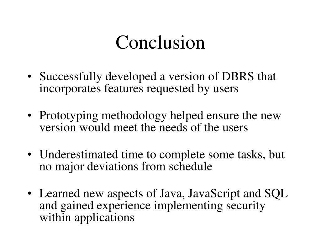 Conclusion • Successfully developed a version of DBRS that incorporates features requested by users • Prototyping methodology helped ensure the new version would meet the needs of the users • Underestimated time to complete some tasks, but no major deviations from schedule • Learned new aspects of Java, JavaScript and SQL and gained experience implementing security within applications