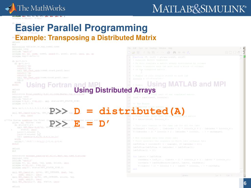 Using Distributed Arrays P>> D = distributed(A) P>> E = D’ Easier Parallel Programming Example: Transposing a Distributed Matrix Using MATLAB and MPI Using Fortran and MPI