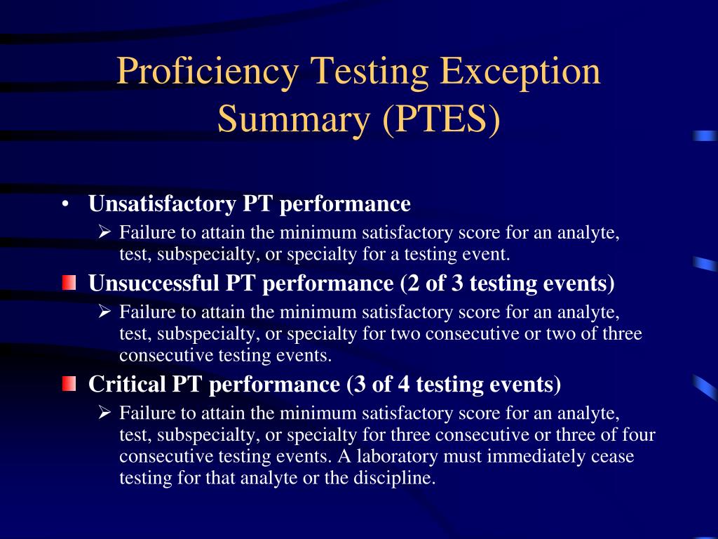 Proficiency Testing Exception Summary (PTES) • Unsatisfactory PT performance • Failure to attain the minimum satisfactory score for an analyte, test, subspecialty, or specialty for a testing event. • Unsuccessful PT performance (2 of 3 testing events) • Failure to attain the minimum satisfactory score for an analyte, test, subspecialty, or specialty for two consecutive or two of three consecutive testing events. • Critical PT performance (3 of 4 testing events) • Failure to attain the minimum satisfactory score for an analyte, test, subspecialty, or specialty for three consecutive or three of four consecutive testing events. A laboratory must immediately cease testing for that analyte or the discipline.