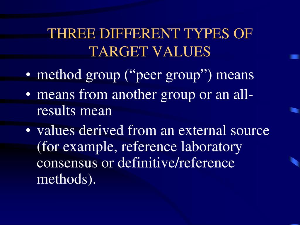 THREE DIFFERENT TYPES OF TARGET VALUES • method group (“peer group”) means • means from another group or an all-results mean • values derived from an external source (for example, reference laboratory consensus or definitive/reference methods).