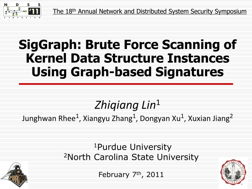 The 18 th Annual Network and Distributed System Security Symposium. S igGraph : Brute Force Scanning of Kernel Data Structure Instances Using Graph-based Signatures Zhiqiang Lin 1 Junghwan Rhee 1 , Xiangyu Zhang 1 , Dongyan Xu 1 , Xuxian Jiang 2. 1 Purdue University
