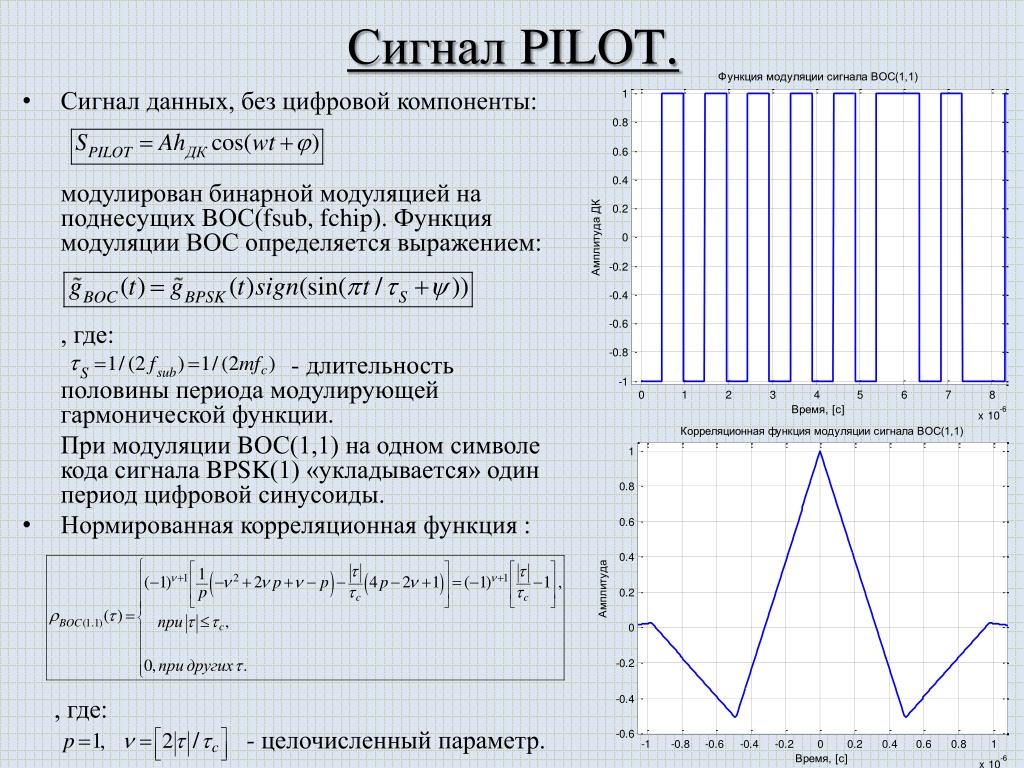 СигналPILOT. • Сигнал данных, без цифровой компоненты: модулирован бинарной модуляцией на поднесущих BОС(fsub, fchip). Функция модуляции ВОС определяется выражением: , где: - длительность половины периода модулирующей гармонической функции. При модуляции BОС(1,1) на одном символе кода сигнала BPSK(1) «укладывается» один период цифровой синусоиды. • Нормированная корреляционная функция : , где: - целочисленный параметр.