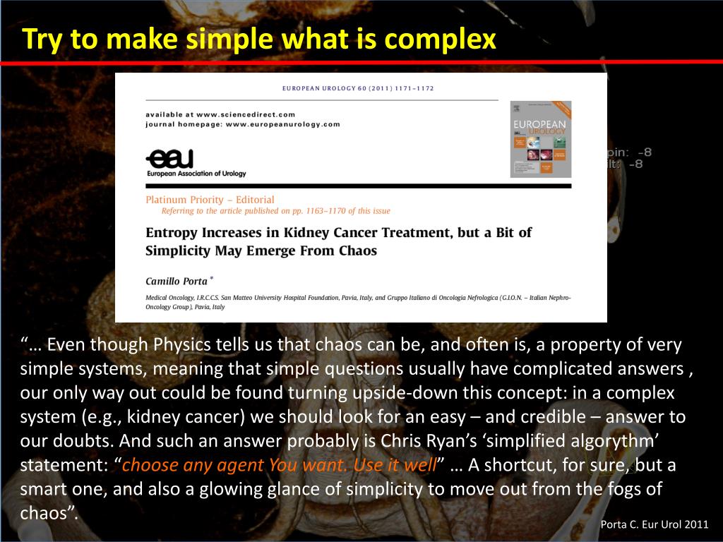 Try to makesimplewhatiscomplex “… EventhoughPhysicstellsusthatchaos can be, and oftenis, a property of verysimplesystems, meaningthatsimplequestionsusuallyhavecomplicatedanswers , ouronly way out could be foundturningupside-down thisconcept: in a complexsystem (e.g., kidneycancer) weshould look for an easy – and credible – answer to ourdoubts. And such an answerprobablyis Chris Ryan’s ‘simplifiedalgorythm’ statement: “chooseany agent Youwant. Use itwell” … A shortcut, for sure, but a smartone, and also a glowingglance of simplicity to move out from the fogs of chaos”. Porta C. EurUrol2011