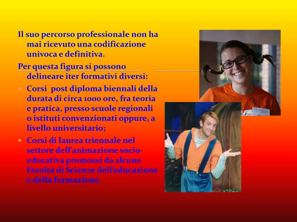 Ilsuo percorso professionale non ha mai ricevuto una codificazione univoca e definitiva. Per questa figura si possono delineare iter formativi diversi: • Corsi post diploma biennali della durata di circa 1000 ore, fra teoria e pratica, presso scuole regionali o istituti convenzionati oppure, a livello universitario; • Corsi di laurea triennale nel settore dell’animazione socio-educativa promossi da alcune Facoltà di Scienze dell’educazione e della formazione.