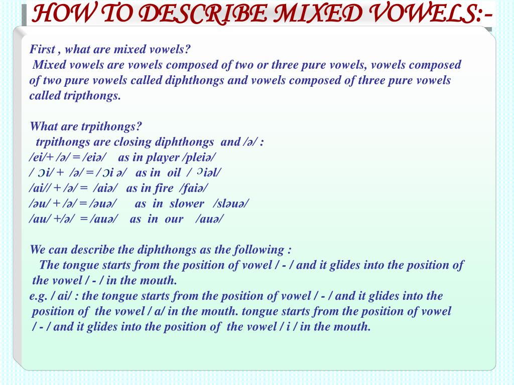 HOW TO DESCRIBE MIXED VOWELS:- First , what are mixed vowels? Mixed vowels are vowels composed of two or three pure vowels, vowels composed of two pure vowels called diphthongs and vowels composed of three pure vowels called tripthongs. What are trpithongs? trpithongs are closing diphthongs and /ə/ : /ei/+ /ə/ = /eiə/ as in player /pleiə/ / i/ + /ə/ = / i ə/ as in oil / iəl/ /ai// + /ə/ = /aiə/ as in fire /faiə/ /əu/ + /ə/ = /əuə/ as in slower /sləuə/ /au/ +/ə/ = /auə/ as in our /auə/ We can describe the diphthongs as the following : The tongue starts from the position of vowel / - / and it glides into the position of the vowel / - / in the mouth. e.g. / ai/ : the tongue starts from the position of vowel / - / and it glides into the position of the vowel / a/ in the mouth. tongue starts from the position of vowel / - / and it glides into the position of the vowel / i / in the mouth. c c c