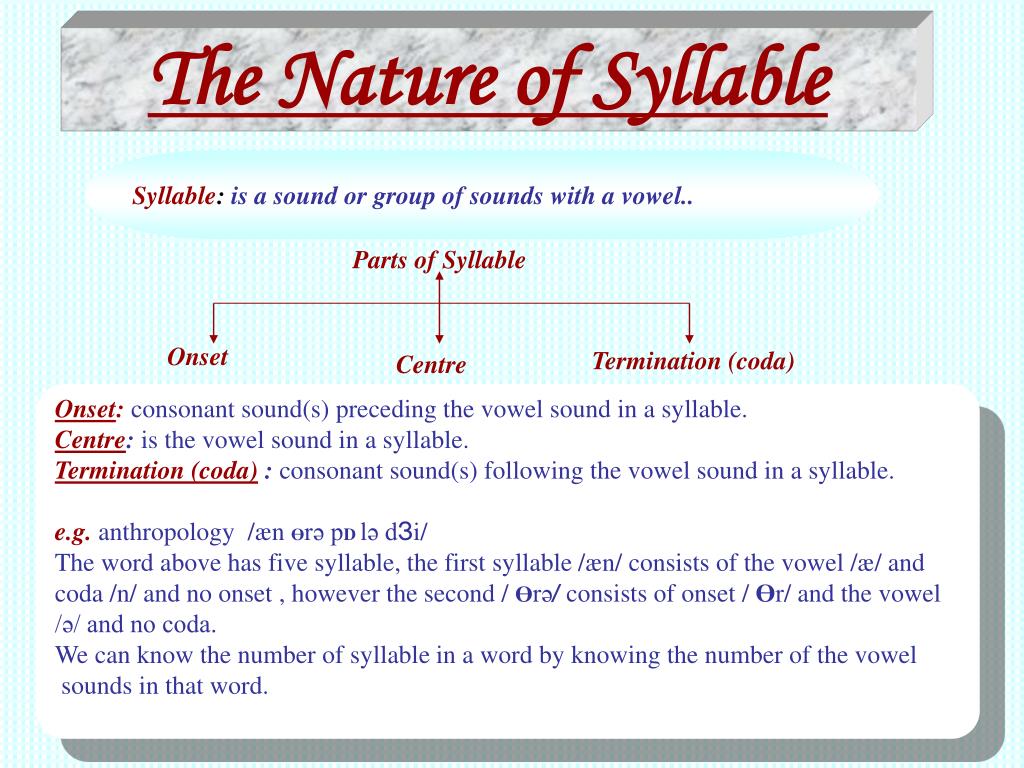 The Nature of Syllable Syllable: is a sound or group of sounds with a vowel.. Parts of Syllable Termination (coda) Onset Centre Onset:consonant sound(s) preceding the vowel sound in a syllable. Centre: is the vowel sound in a syllable. Termination (coda) : consonant sound(s) following the vowel sound in a syllable. e.g.anthropology /æn Өrə pD lə dЗi/ The word above has five syllable, the first syllable /æn/ consists of the vowel /æ/ and coda /n/ and no onset , however the second / Өrə/ consists of onset /Өr/ and the vowel /ə/ and no coda. We can know the number of syllable in a word by knowing the number of the vowel sounds in that word.