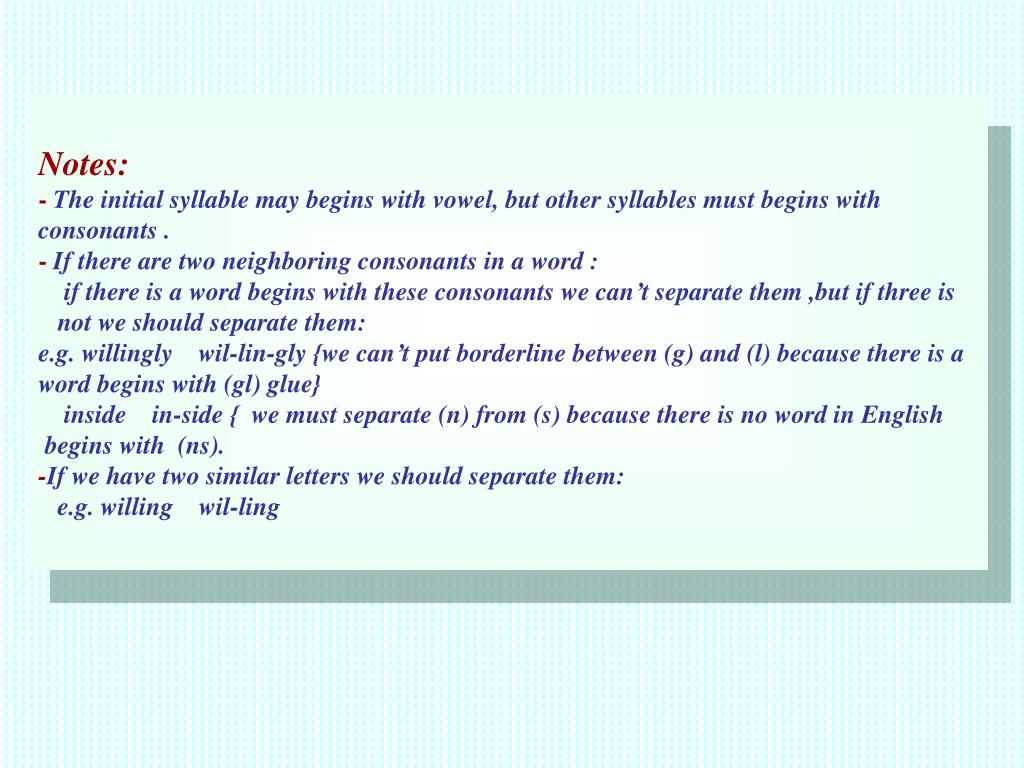 Notes: - The initial syllable may begins with vowel, but other syllables must begins with consonants . - If there are two neighboring consonants in a word : if there is a word begins with these consonants we can’t separate them ,but if three is not we should separate them: e.g. willingly wil-lin-gly {we can’t put borderline between (g) and (l) because there is a word begins with (gl) glue} inside in-side { we must separate (n) from (s) because there is no word in English begins with (ns). -If we have two similar letters we should separate them: e.g. willing wil-ling