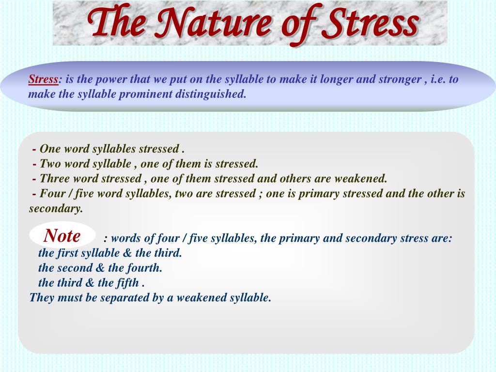 The Nature of Stress Stress: is the power that we put on the syllable to make it longer and stronger , i.e. to make the syllable prominent distinguished. -One word syllables stressed . - Two word syllable , one of them is stressed. - Three word stressed , one of them stressed and others are weakened. - Four / five word syllables, two are stressed ; one is primary stressed and the other is secondary. * : words of four / five syllables, the primary and secondary stress are: the first syllable & the third. the second & the fourth. the third & the fifth . They must be separated by a weakened syllable. Note