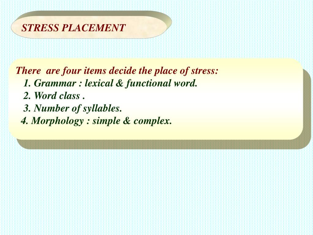 STRESS PLACEMENT There are four items decide the place of stress: 1. Grammar : lexical & functional word. 2. Word class . 3. Number of syllables. 4. Morphology : simple & complex.