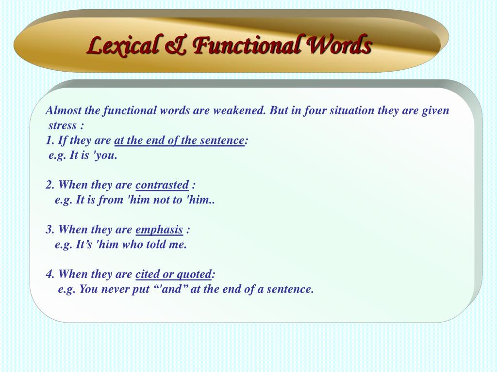 Lexical & Functional Words Almost the functional words are weakened. But in four situation they are given stress : 1. If they are at the end of the sentence: e.g. It is 'you. 2. When they are contrasted : e.g. It is from 'him not to 'him.. 3. When they are emphasis : e.g. It’s 'him who told me. 4. When they are cited or quoted: e.g. You never put “'and” at the end of a sentence.