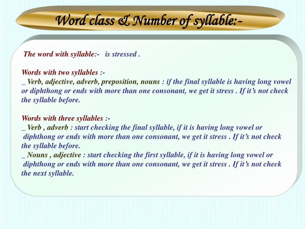 Word class & Number of syllable:- The word with syllable:- is stressed . Words with two syllables :- _ Verb, adjective, adverb, preposition, nouns : if the final syllable is having long vowel or diphthong or ends with more than one consonant, we get it stress . If it’s not check the syllable before. Words with three syllables :- _ Verb , adverb : start checking the final syllable, if it is having long vowel or diphthong or ends with more than one consonant, we get it stress . If it’s not check the syllable before. _ Nouns , adjective : start checking the first syllable, if it is having long vowel or diphthong or ends with more than one consonant, we get it stress . If it’s not check the next syllable.