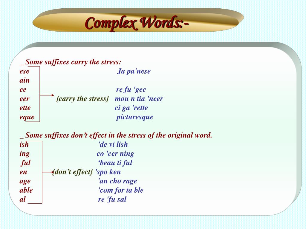 Complex Words:- _ Some suffixes carry the stress: ese Ja pa'nese ain ee re fu 'gee eer {carry the stress} mou n tia 'neer ette ci ga 'rette eque picturesque _ Some suffixes don’t effect in the stress of the original word. ish 'de vi lish ing co 'cer ning ful ‘beau ti ful en{don’t effect} 'spo ken age 'an cho rage able 'com for ta ble al re 'fu sal