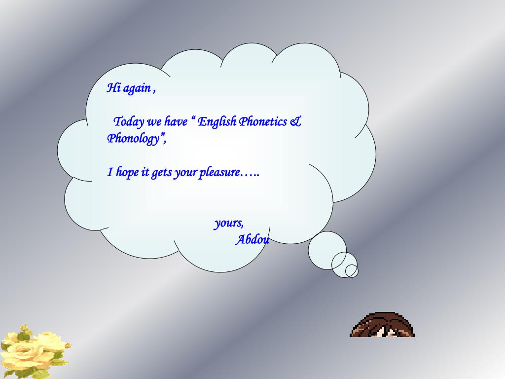 ENGLISH PHONETICS & PHONOLOGY. Designed by/ Abd El Wadoud. Hi again , Today we have “ English Phonetics & Phonology”, I hope it gets your pleasure….. yours, Abdou. ENGLISH PHOETICS & PHONOLOGY.