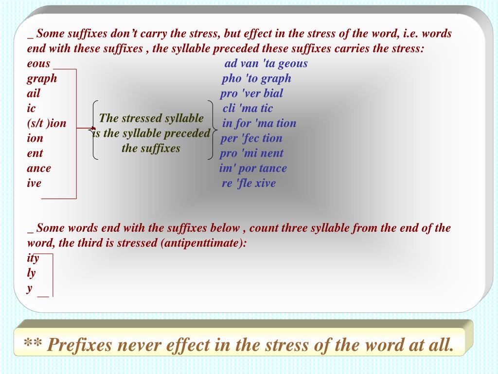 _ Some suffixes don’t carry the stress, but effect in the stress of the word, i.e. words end with these suffixes , the syllable preceded these suffixes carries the stress: eous ad van 'ta geous graph pho 'to graph ailpro 'ver bial ic cli 'ma tic (s/t )ionin for 'ma tion ion per 'fec tion ent pro 'mi nent ance im' por tance ivere 'fle xive _ Some words end with the suffixes below , count three syllable from the end of the word, the third is stressed (antipenttimate): ity ly y The stressed syllable is the syllable preceded the suffixes ** Prefixes never effect in the stress of the word at all.
