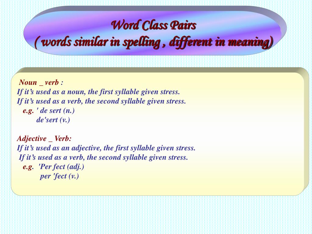 Word Class Pairs ( words similar in spelling , different in meaning) Noun _ verb : If it’s used as a noun, the first syllable given stress. If it’s used as a verb, the second syllable given stress. e.g. ' de sert (n.) de'sert (v.) Adjective _ Verb: If it’s used as an adjective, the first syllable given stress. If it’s used as a verb, the second syllable given stress. e.g. 'Per fect (adj.) per 'fect (v.)
