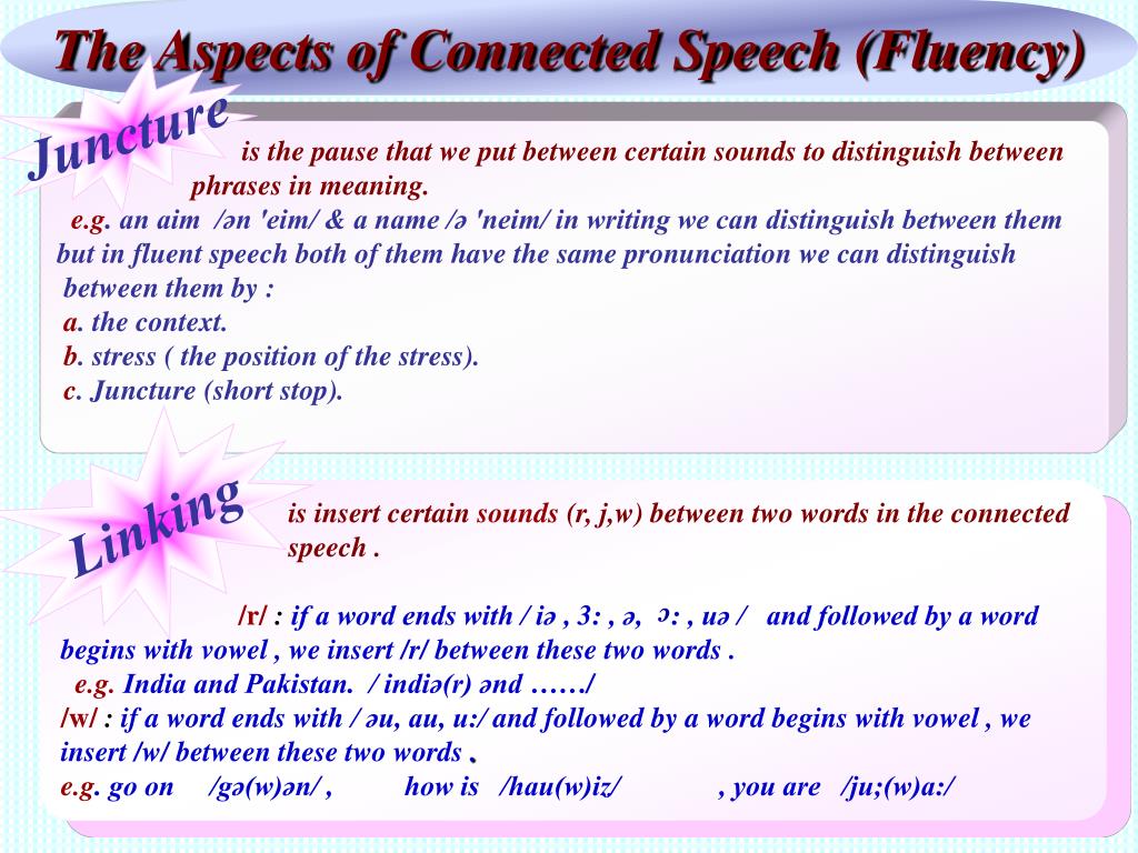 The Aspects of Connected Speech (Fluency) Juncture is the pause that we put between certain sounds to distinguish between phrases in meaning. e.g. an aim /ən 'eim/ & a name /ə 'neim/ in writing we can distinguish between them but in fluent speech both of them have the same pronunciation we can distinguish between them by : a. the context. b. stress ( the position of the stress). c. Juncture (short stop). Linking is insert certain sounds (r, j,w) between two words in the connected speech . /r/ : if a word ends with / iə , 3: , ə, : , uə / and followed by a word begins with vowel , we insert /r/ between these two words . e.g. India and Pakistan. / indiə(r) ənd ……/ /w/ : if a word ends with/ əu, au, u:/and followed by a word begins with vowel , we insert /w/ between these two words . e.g. go on /gə(w)ən/ , how is /hau(w)iz/ , you are /ju;(w)a:/ c