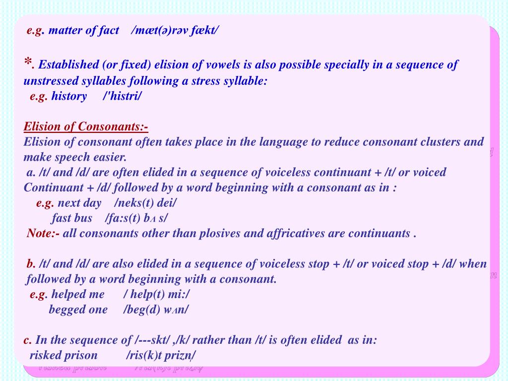 e.g. matter of fact /mæt(ə)rəv fækt/ *. Established (or fixed) elision of vowels is also possible specially in a sequence of unstressed syllables following a stress syllable: e.g. history /'histri/ Elision of Consonants:- Elision of consonant often takes place in the language to reduce consonant clusters and make speech easier. a. /t/ and /d/ are often elided in a sequence of voiceless continuant + /t/ or voiced Continuant + /d/ followed by a word beginning with a consonant as in : e.g. next day /neks(t) dei/ fast bus /fa:s(t) bΛ s/ Note:- all consonants other than plosives and affricatives are continuants . b. /t/ and /d/ are also elided in a sequence of voiceless stop + /t/ or voiced stop + /d/ when followed by a word beginning with a consonant. e.g. helped me / help(t) mi:/ begged one /beg(d) wΛn/ c. In the sequence of /---skt/ ,/k/ rather than /t/ is often elided as in: / ֽ risked prison /ris(k)t prizn